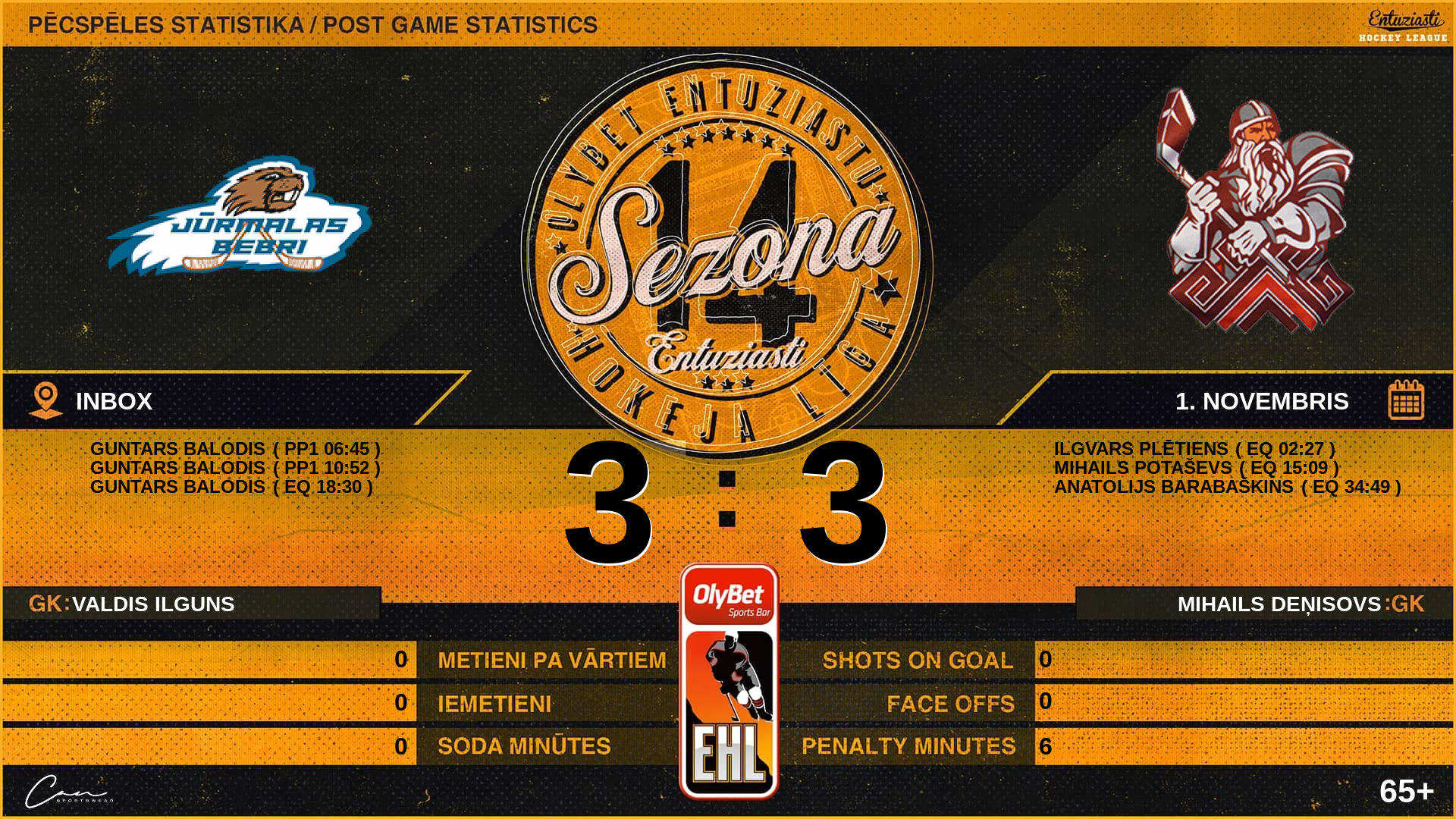 | 18:30 | JRM | Vārti (EQ) | #9 Guntars Balodis, piespēles: #8 Jānis Pabrūklis |