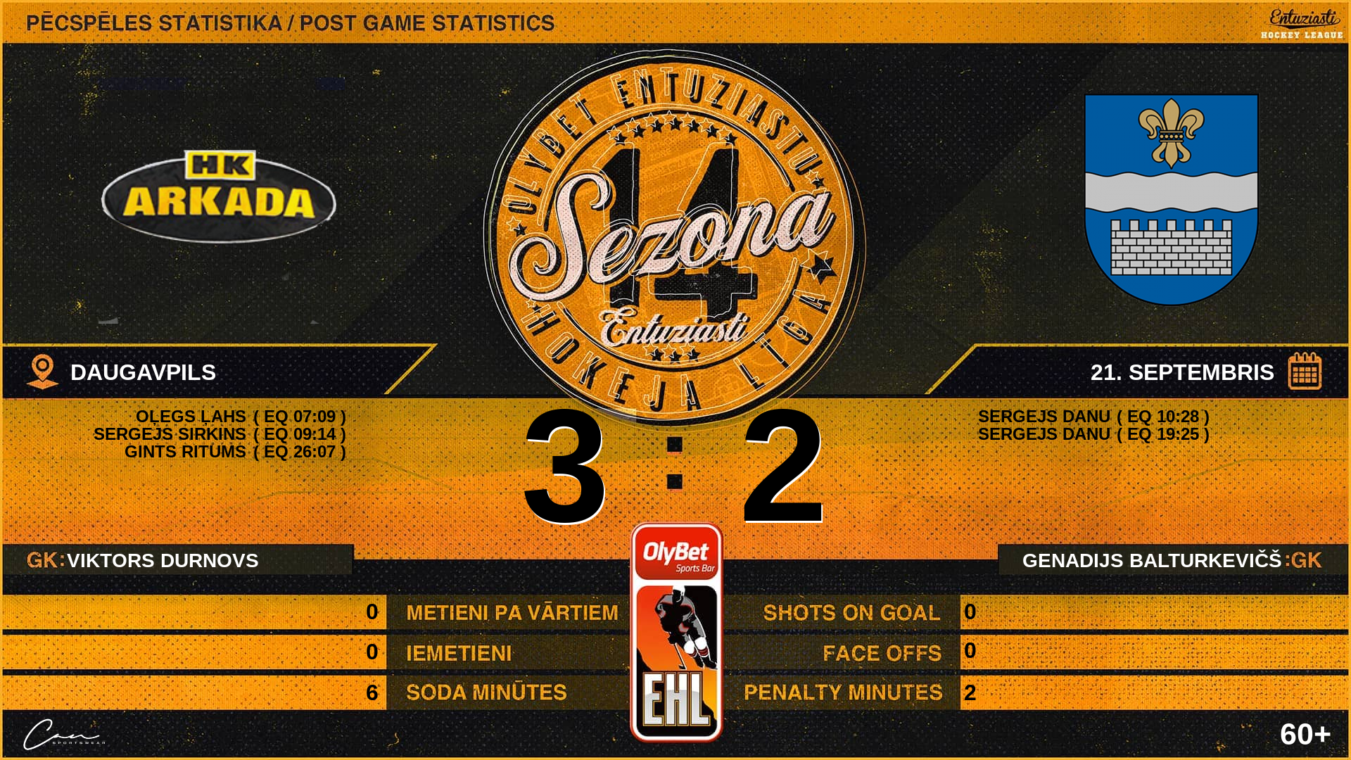 09:14 | ARK | Vārti (EQ) | #14 Sergejs Sirkins, piespēles: #2 Uvis Ritums, #18 Gints Ritums |