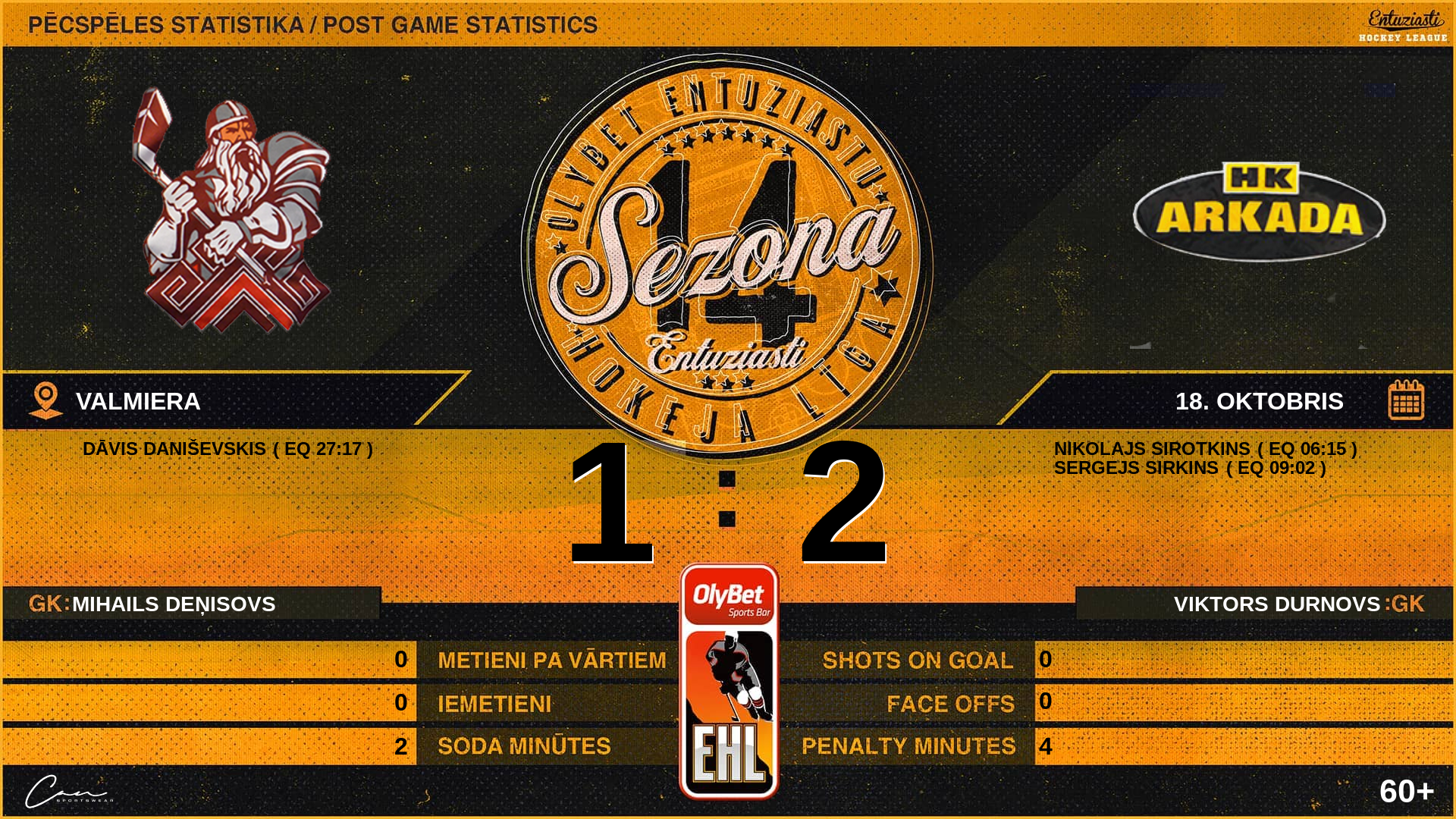 | 09:02 | ARK | Vārti (EQ) | #13 Sergejs Sirkins, piespēles: #44 Nikolajs Sirotkins |