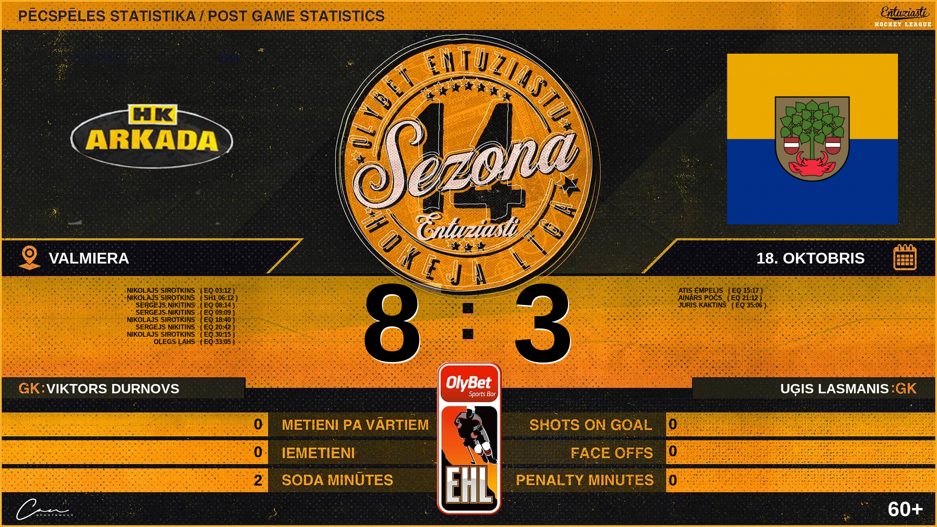 | 09:09 | ARK | Vārti (EQ) | #14 Sergejs Ņikitins, piespēles: #13 Sergejs Sirkins, #44 Nikolajs Sirotkins |