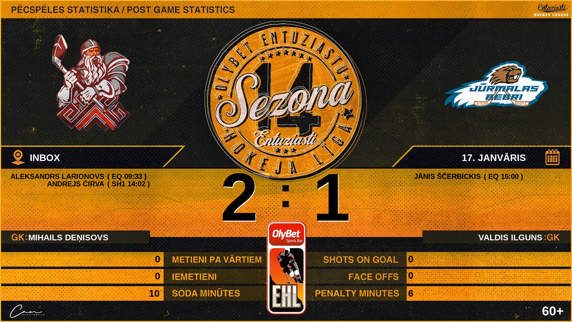 | 16:00 | JRM | Vārti (EQ) | #15 Jānis Ščerbickis, piespēles: #12 Verners Grandāns, #9 Aigars Namnieks |
