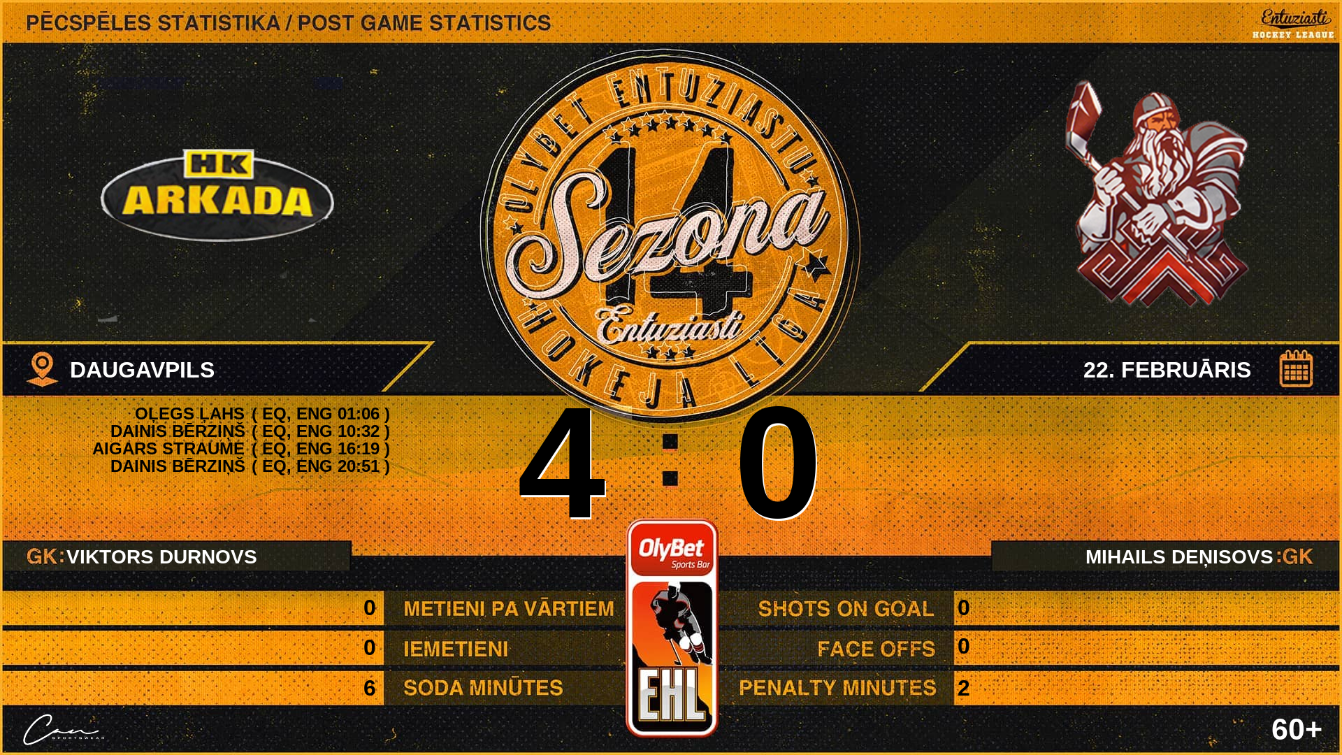 | 20:51 | ARK | Vārti (EQ) | #16 Dainis Bērziņš, piespēles: #44 Uvis Ritums |