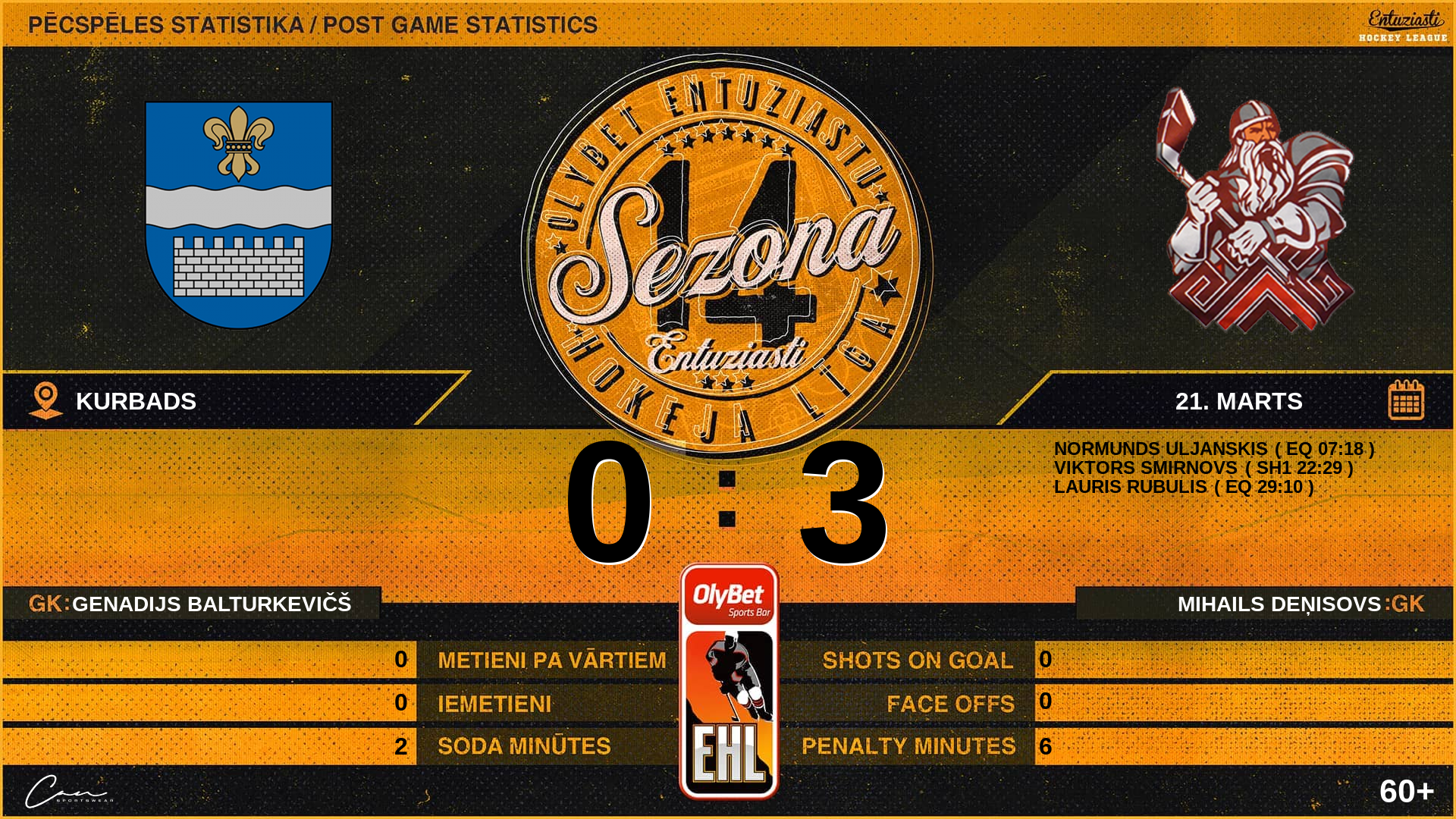 | 00:00 | SNC | GK In | #1 Mihails Deņisovs |